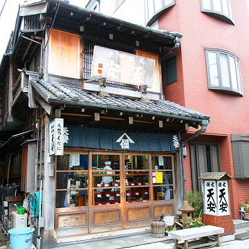 写真右側は、天保8年(1837年)創業の佃煮の老舗、天安本店。