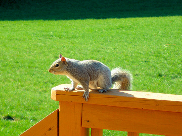 ウッドデッキの柵の上でリス君がお食事中でした。