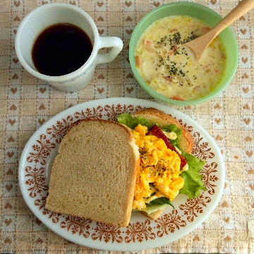 ++ スクランブルエッグのサンドイッチと野菜の豆乳スープ ++