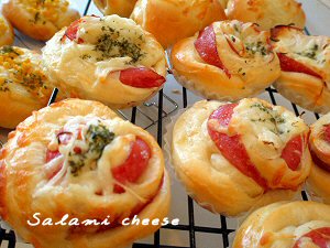 そしてサラミを巻き込んで焼成前にオニオンスライスとチーズを乗せて焼き上げたサラミチーズ。