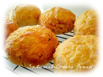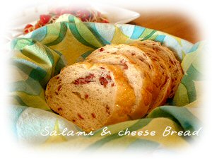 細切りにしたサラミをパン生地に一緒に練りこんで、焼成前に上からすりおろしたエダムチーズをたっぷりと掛けました。